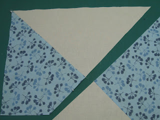 Sew each background square to center square using the crease as a sewing guide.  Lay the 1/4" line of your ruler along the stitched line and trim off the excess triangle leaving a 1/4" seam (cutting through the background fabric and center square fabric).  Discard these triangles.
